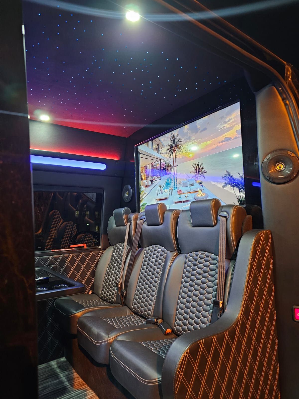 Spacious, upscale, and highly functional. The Sprinter is perfect for team outings, airport shuttles, or wedding parties who want to travel together in style.